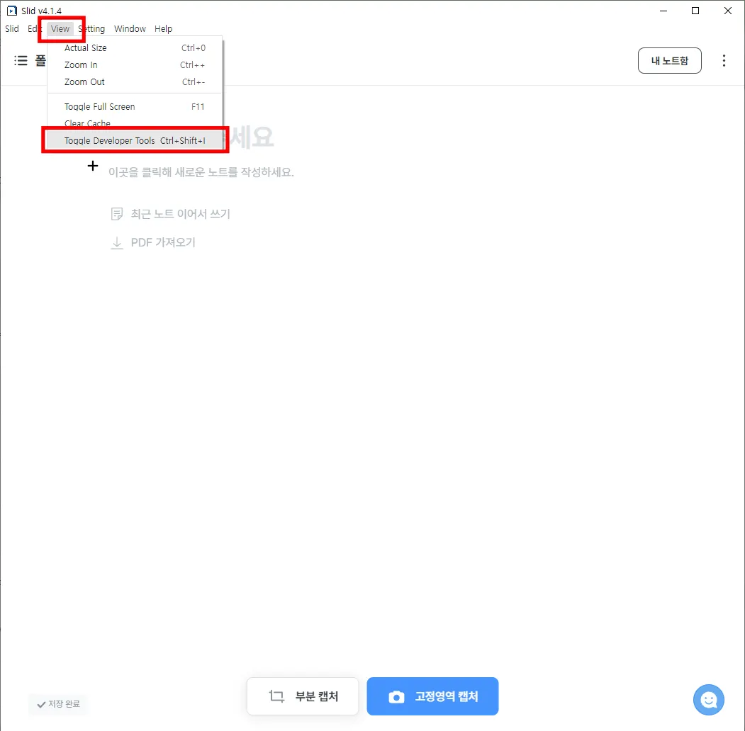 상단의 메뉴에서 View → Toggle Developer Tools를 클릭하여 개발자 도구를 실행합니다.