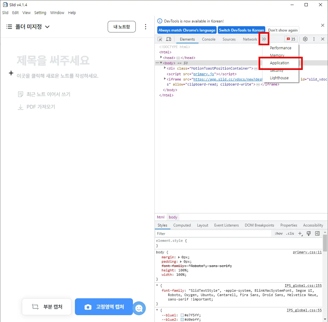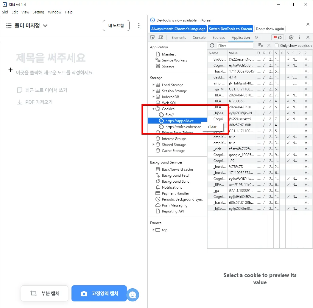 데스크톱 앱에서 개발자 도구를 열어 쿠키를 직접 삭제합니다.