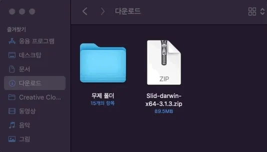 Mac OS의 경우 압축 파일을 풀고, 슬리드 프로그램을 컴퓨터의 응용 프로그램 폴더로 옮겨 주세요.
