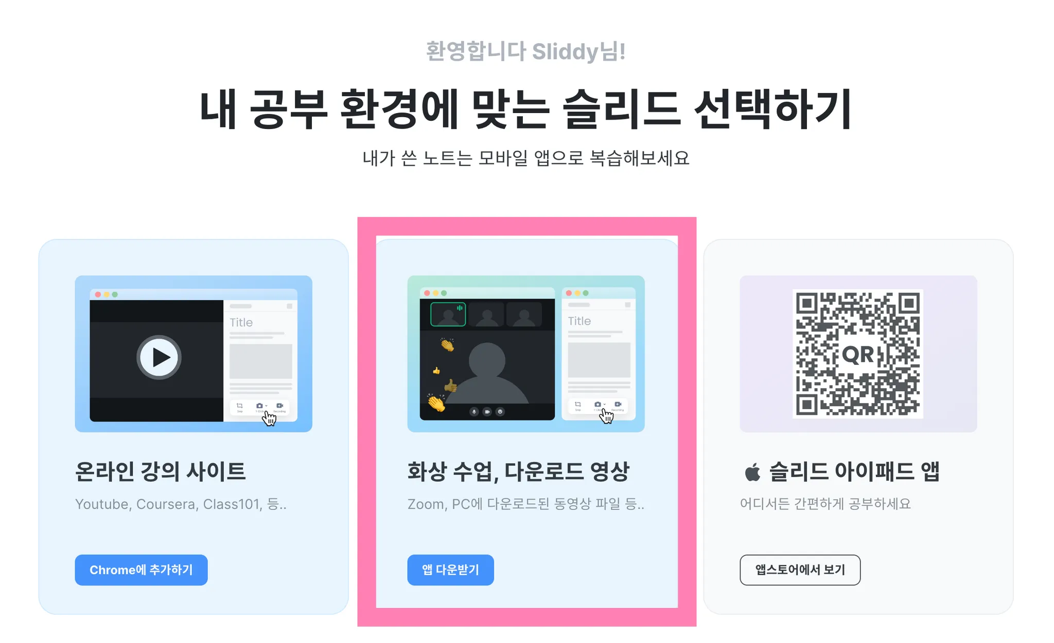 줌이나 구글미트 등 온라인 비대면 강의를 자주 수강한다면 실시간 화상 수업 슬리드를 선택하세요.