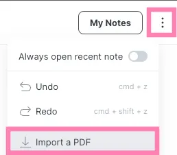 You can also import PDF by clicking more button next to My Notes button.