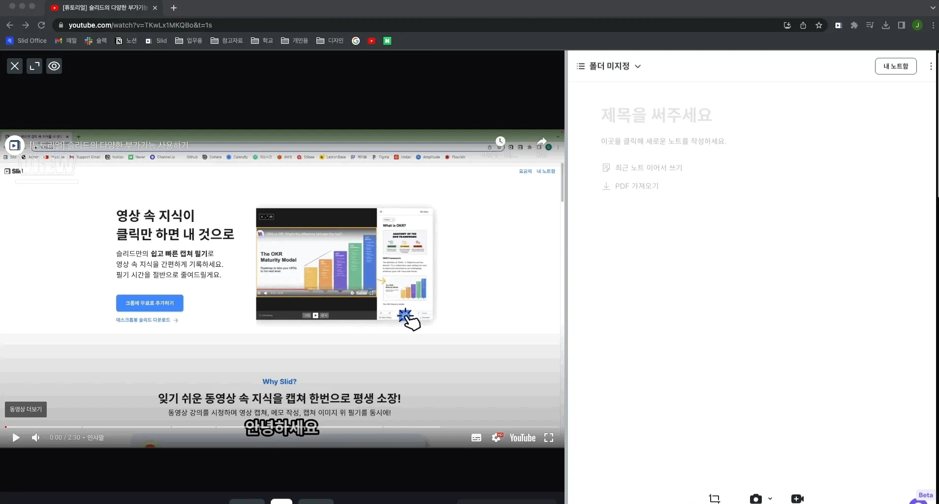 영상 화면과 노트 화면 사이에 있는 회색 선을 클릭하고 움직이면 분할 화면 비율을 조절할 수 있어요.