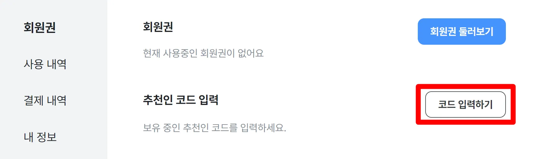 현재 사용중인 회원권이 있는 경우 추천인 코드 입력 버튼이 보이지 않아요.