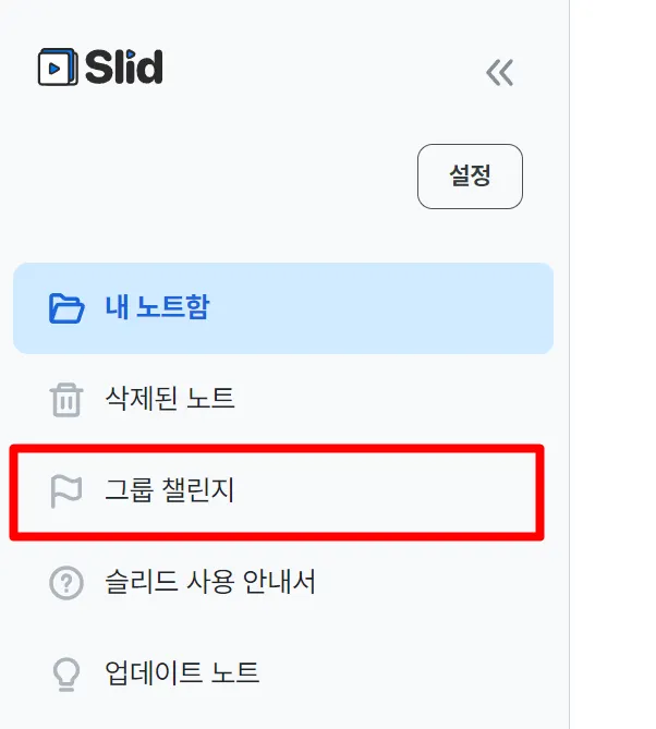 내 노트함 왼쪽 메뉴바에서 그룹 챌린지 탭을 확인할 수 있어요.