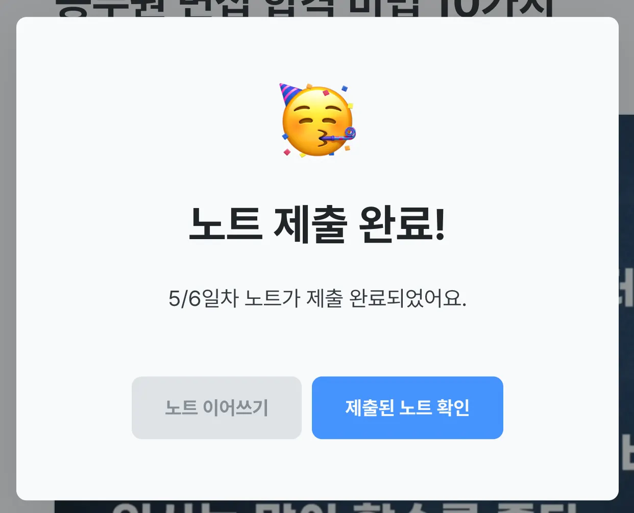 노트를 제출하면 제출 완료 팝업(모달)이 표시돼요.