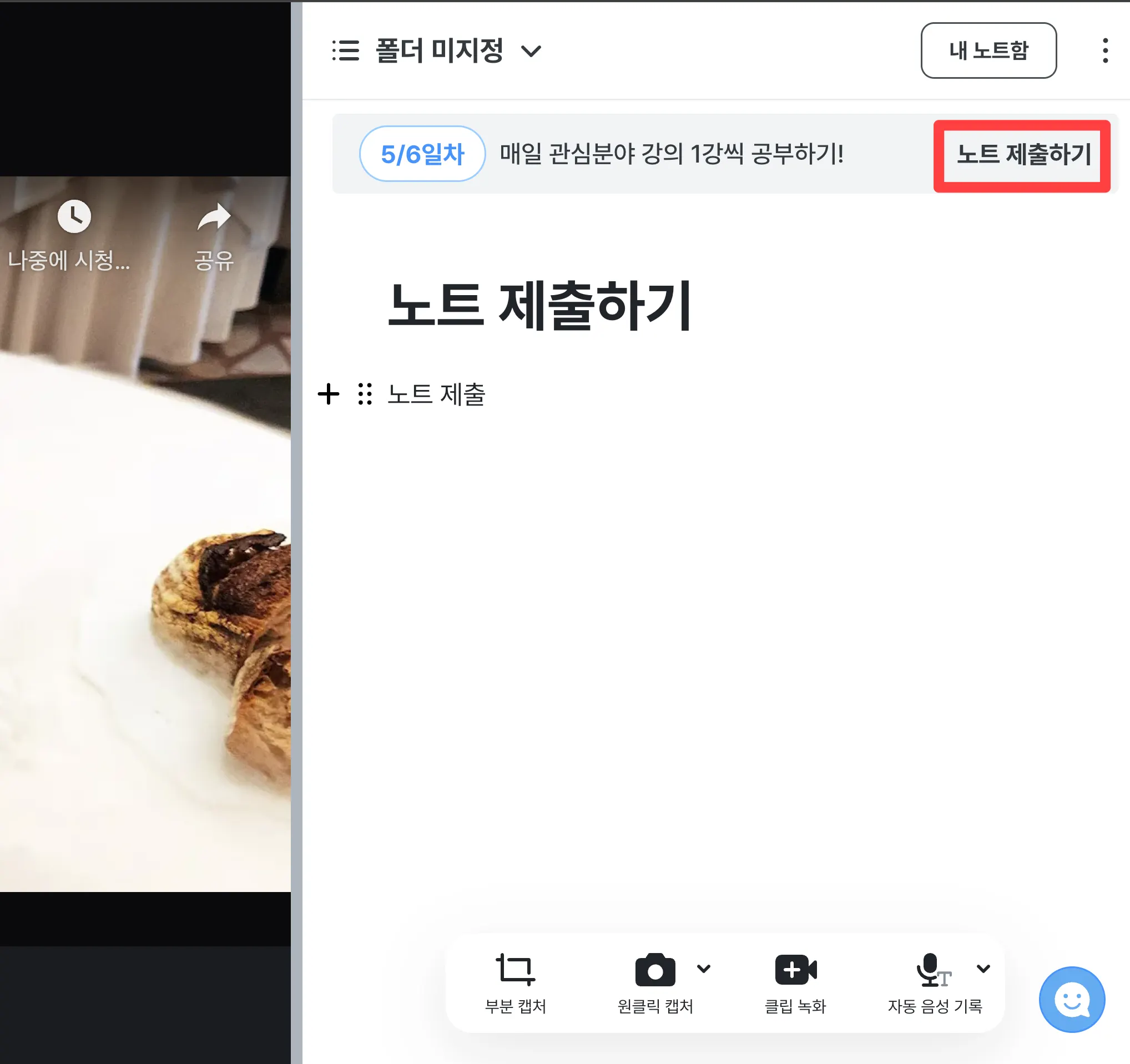 노트 제출은 영상 노트 또는 내 노트함 노트에서 할 수 있어요.