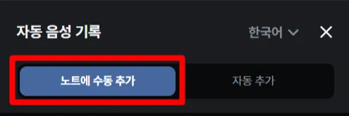 패널의 토글에서 자동 추가로 변경하면 기존과 같이 모든 음성 인식 내용을 노트로 옮길 수 있어요.