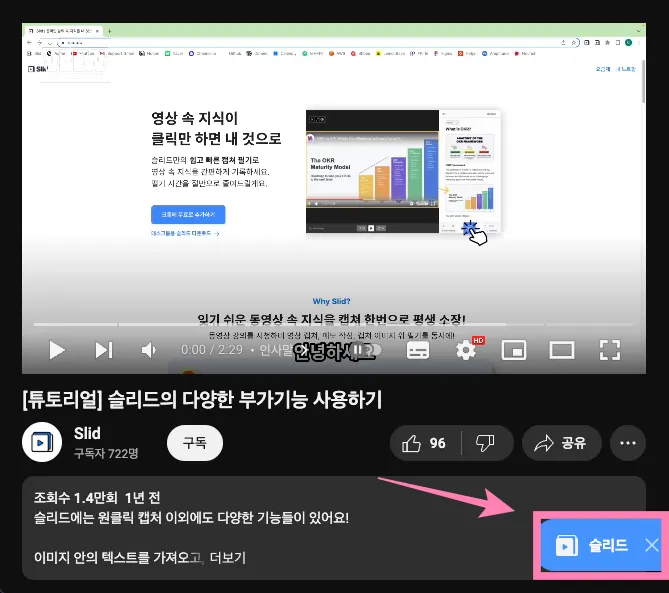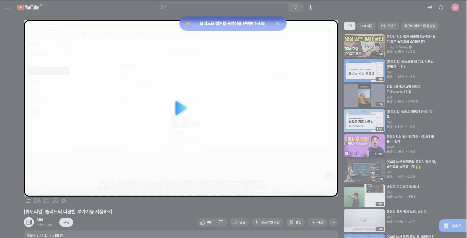 슬리드로 캡처할 수 있는 영상이 있는 곳에 파란 삼각형이 생겨나요. 필기하고 싶은 영상을 클릭해 주세요.