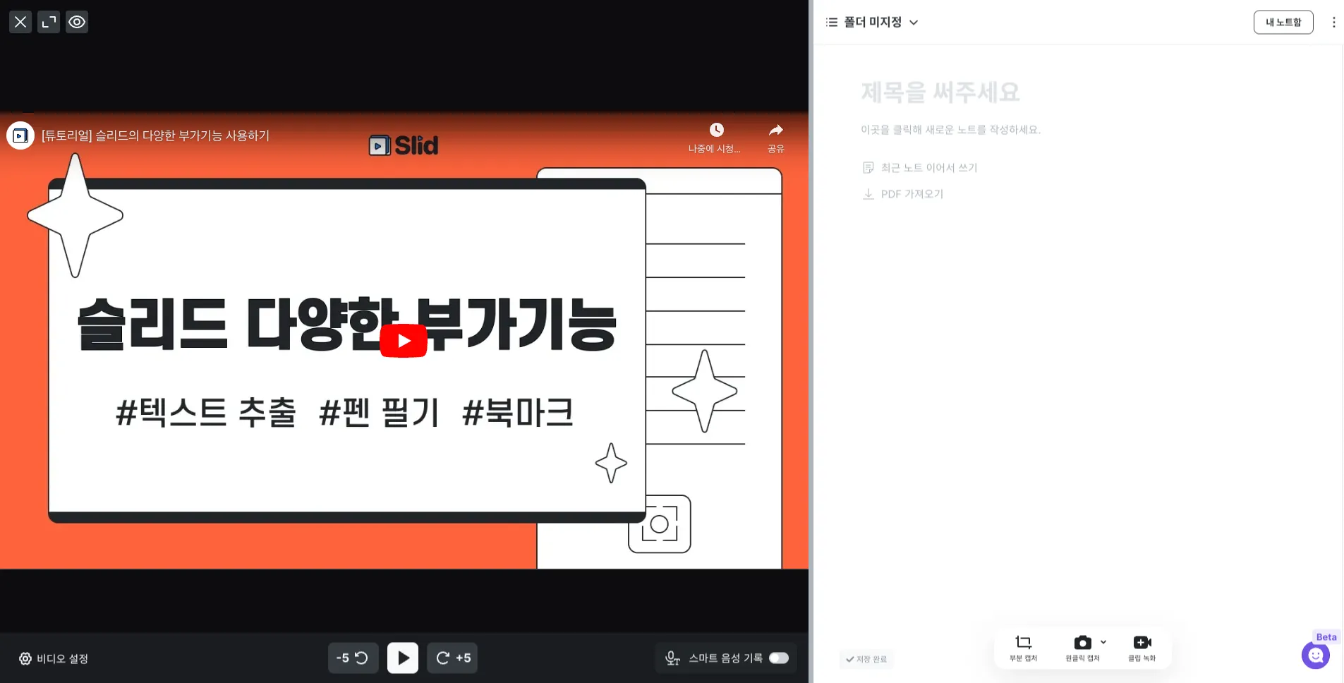 오른쪽 아래 원클릭 캡처 버튼을 이용해 영상을 보면서 간편하게 캡처하고 필기해 보세요.
