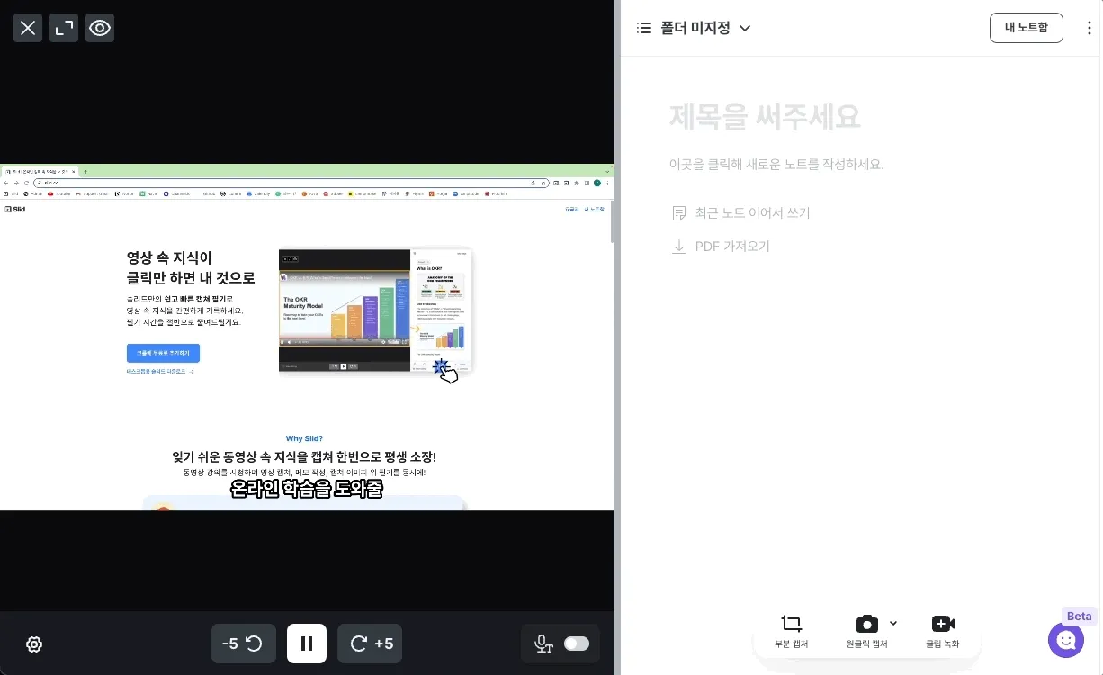 이렇게 분할 화면으로 영상 화면과 노트 화면이 열리면 성공이에요.