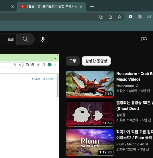 유튜브에서는 오른쪽 아래 슬리드 버튼으로 더 빠르게 노트를 켤 수 있어요.