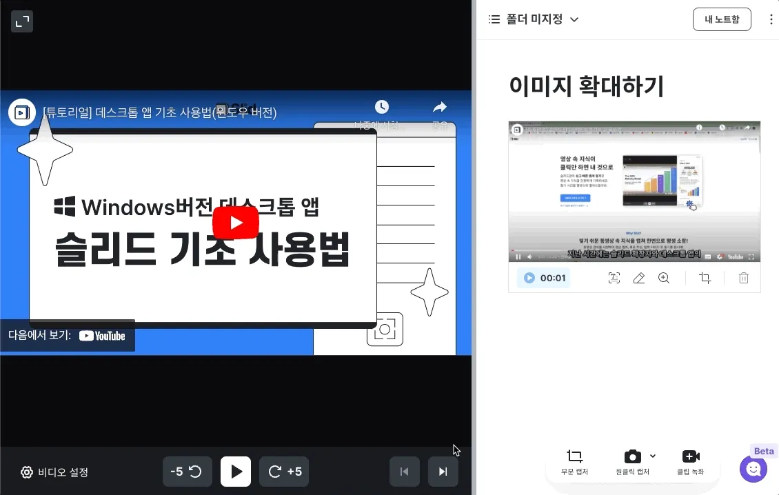 영상 화면과 노트 화면 사이에 있는 회색 선을 클릭하고 움직이면 분할 화면 비율을 조절할 수 있어요.