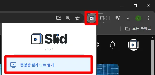 주소창 옆 슬리드 아이콘 → 동영상 필기 노트 열기 버튼으로 노트를 시작하면 팝업이 표시되지 않아요.